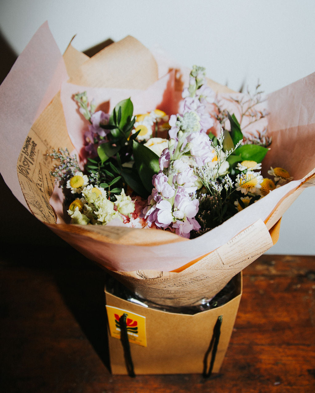 A delicate bouquet of pink spray roses and fragrant stocks in soft pink and white tones, accented with lush greenery.